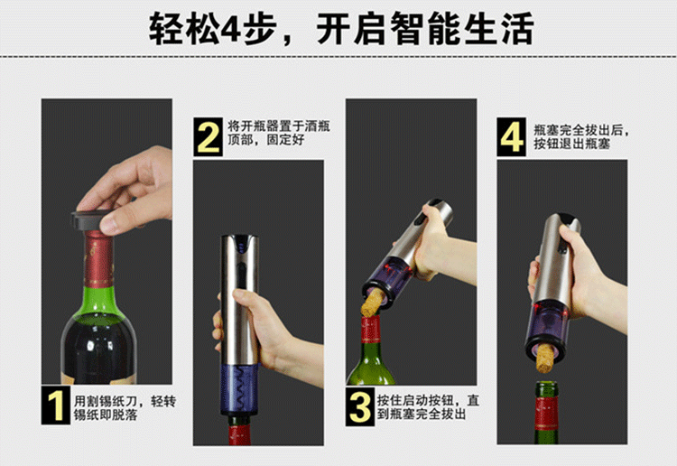 产品配置:不锈钢电动开瓶器、电源线、割纸刀