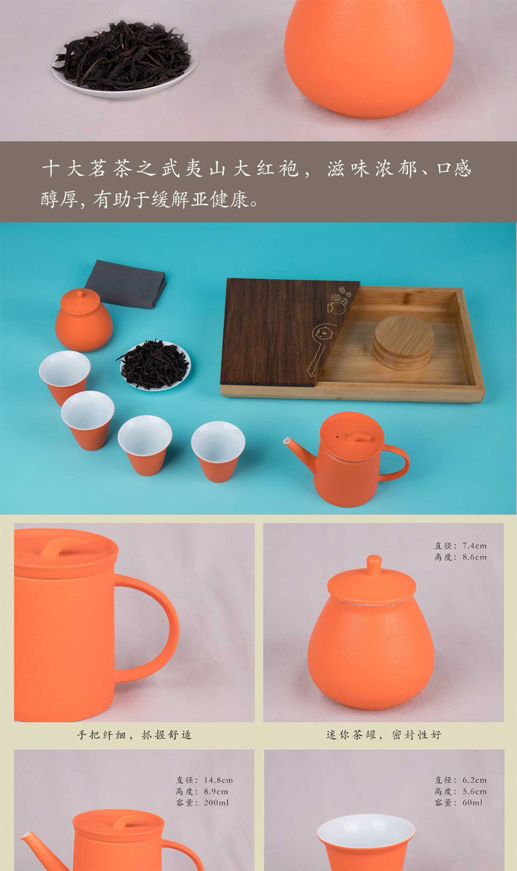 配置:茶壶一个,茶杯四个,两件式茶盘一套,含15克大红袍一罐,茶巾一条,含提手锦盒包装
